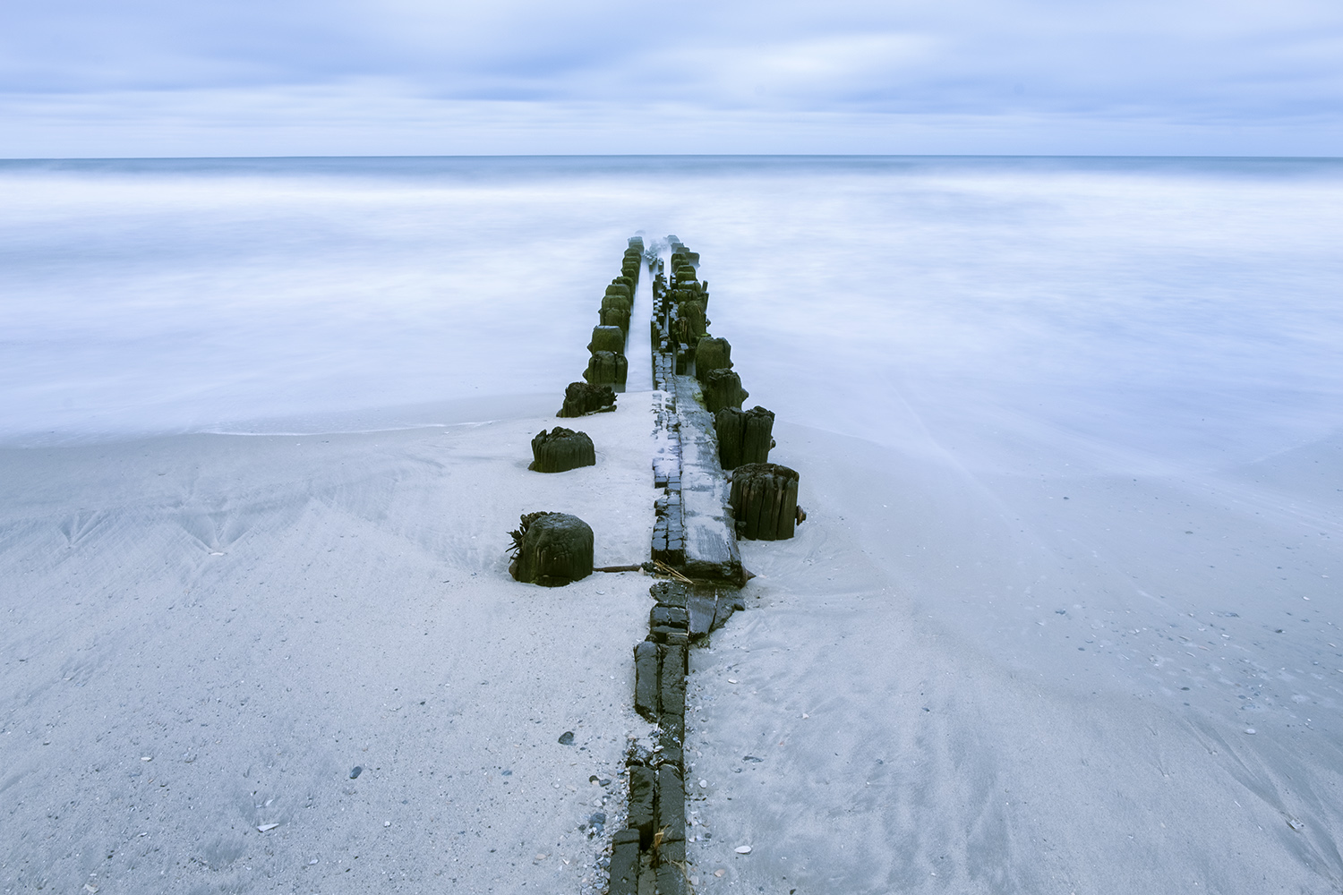 This time my tripod made it to the beach, since the light was dim enough to shoot with longer exposures, capturing the waves in motion as they lapped up on the sand. I decided it was time to try a really long time exposure since the conditions were just right, so I parked myself by the remains of an old pier, locked off the camera and shot out to sea for thirty seconds. The results really weren’t that bad.