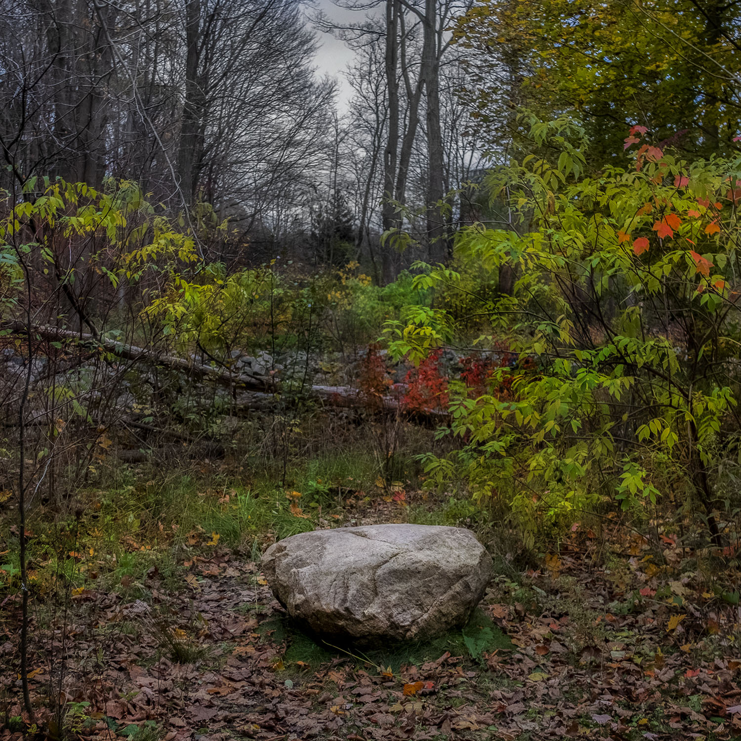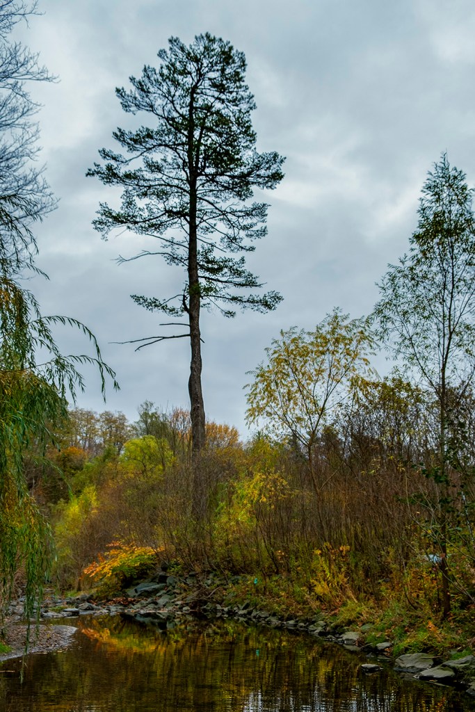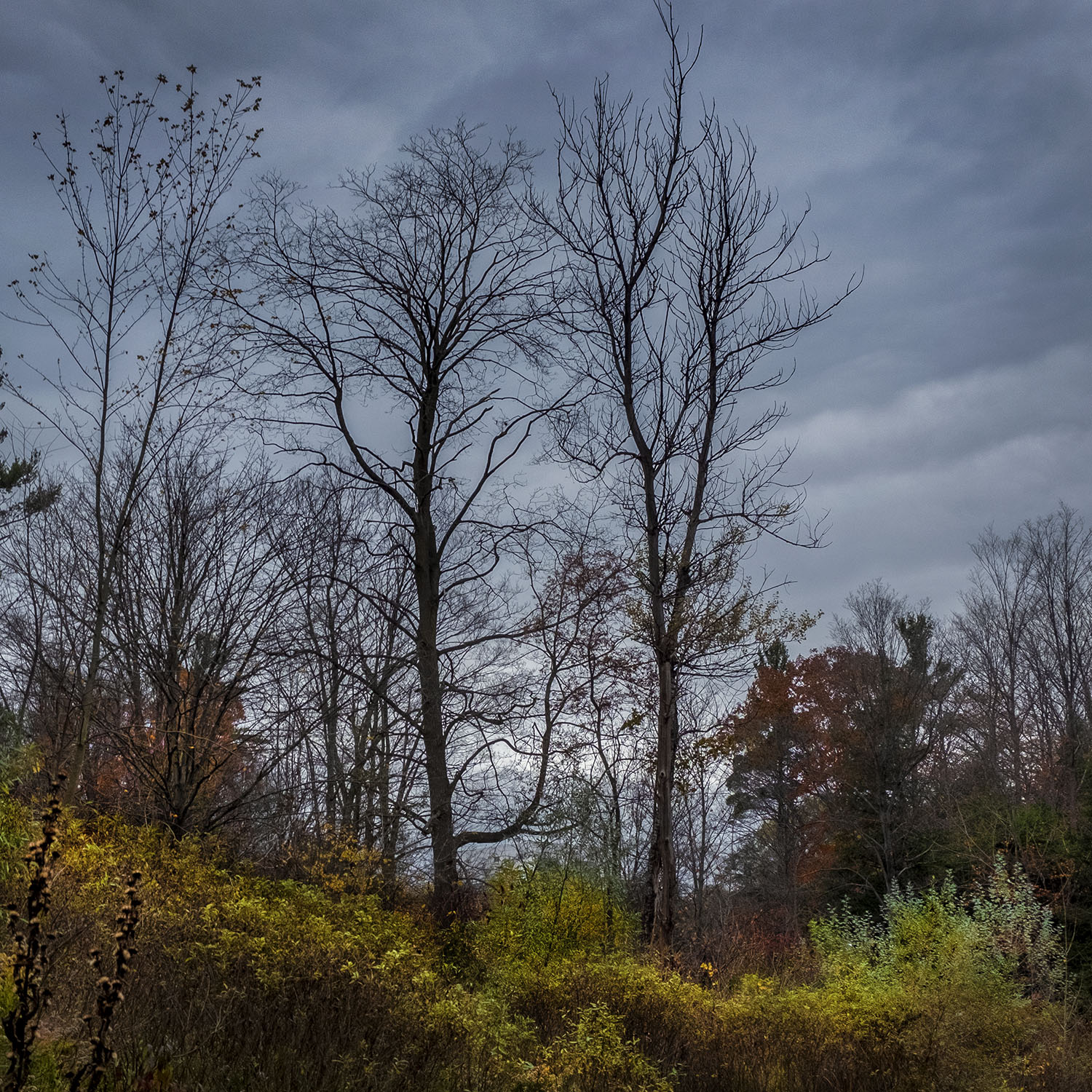THE FALL COLOURS ARE FADING FAST on this day in late October, which makes their beauty even more subtle, especially under a cool sky. The forest here is remarkably varied for a city park, with Eastern Hemlock, Black Cherry, Sugar Maple, American Beech, Red Oak and Hop Hornbeams bare now against the clouds or barely holding on to their last red and yellow leaves, while the evergreens emerge from the background to dominate the landscape with the only colour that will abide through the coming winter.