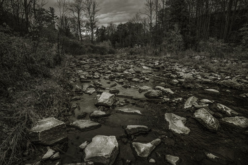 On a day when the clouds are low and heavy, the creek flows coolly over a creek bed punctuated frequently with little bubbling rapids of rocks, the water dark as oil under the fall sky. As with every other waterway I’ve visited in my city during lockdown, the views are the most rewarding when you wander off the trail and onto the dirt paths down to the water.