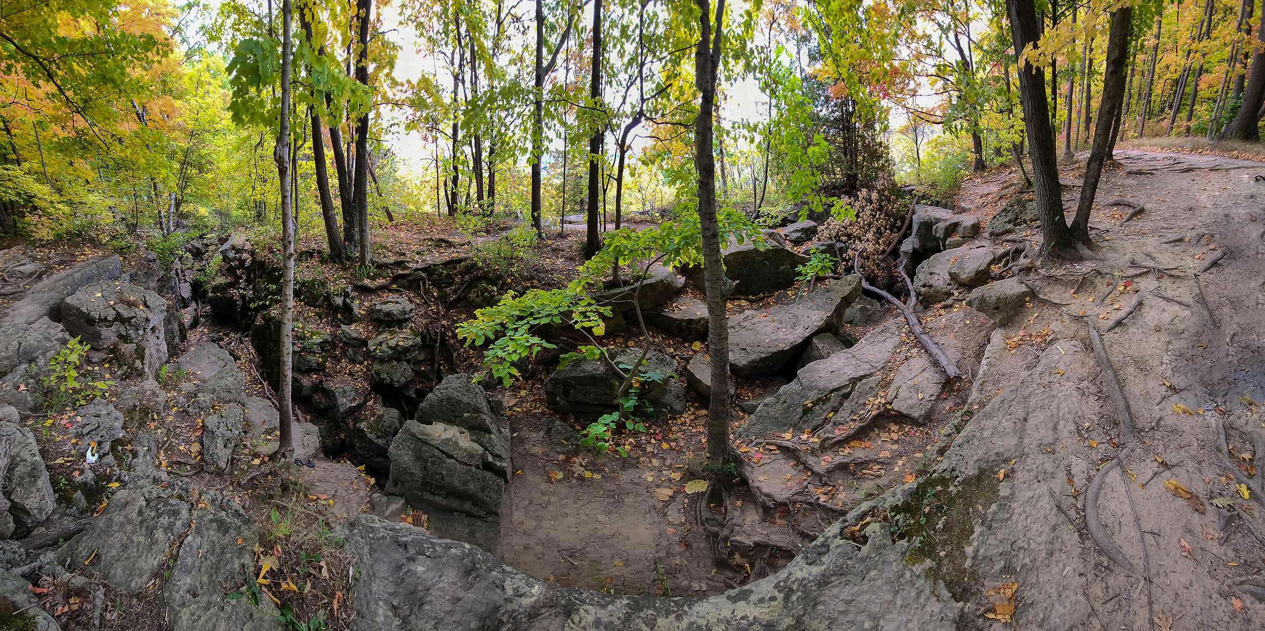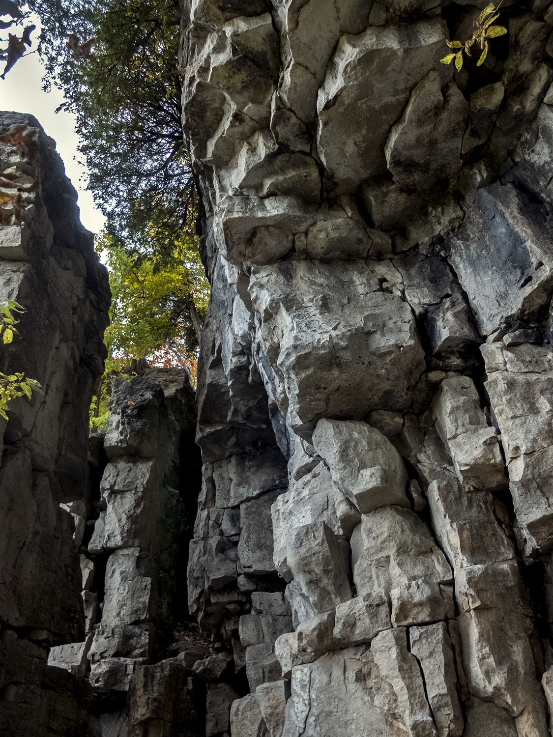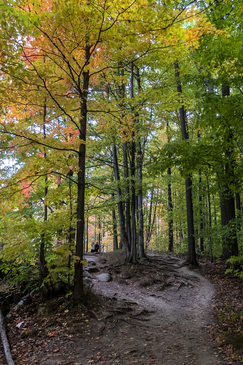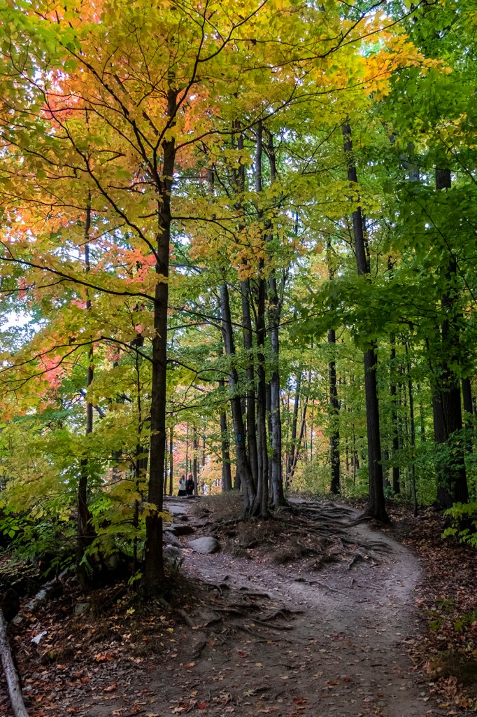 Even for such short trails there’s a lot of variety, from the cliffside lookouts to the fissures opening up in the limestone caprock to stretches of woodland trails that change from colourful deciduous woods to pine forests. Some parts of the trail were in full colour, in yellow, orange and red, on our day there, while others were just starting to change – a testament to the varying microclimates along the escarpment.