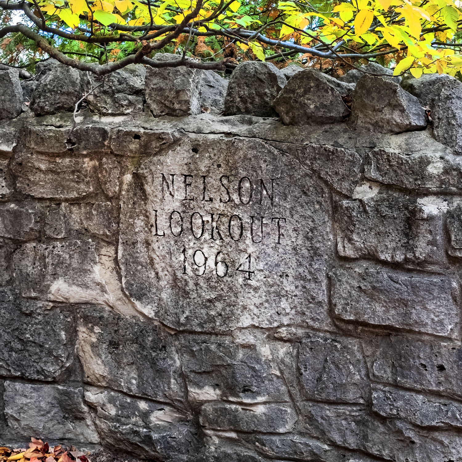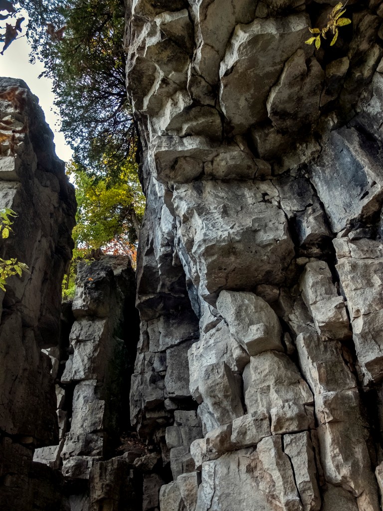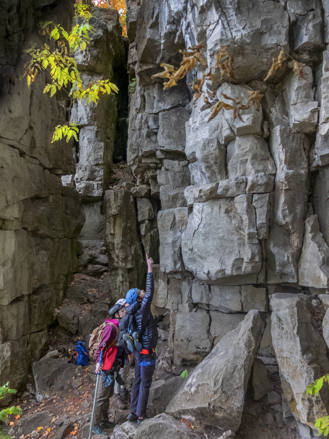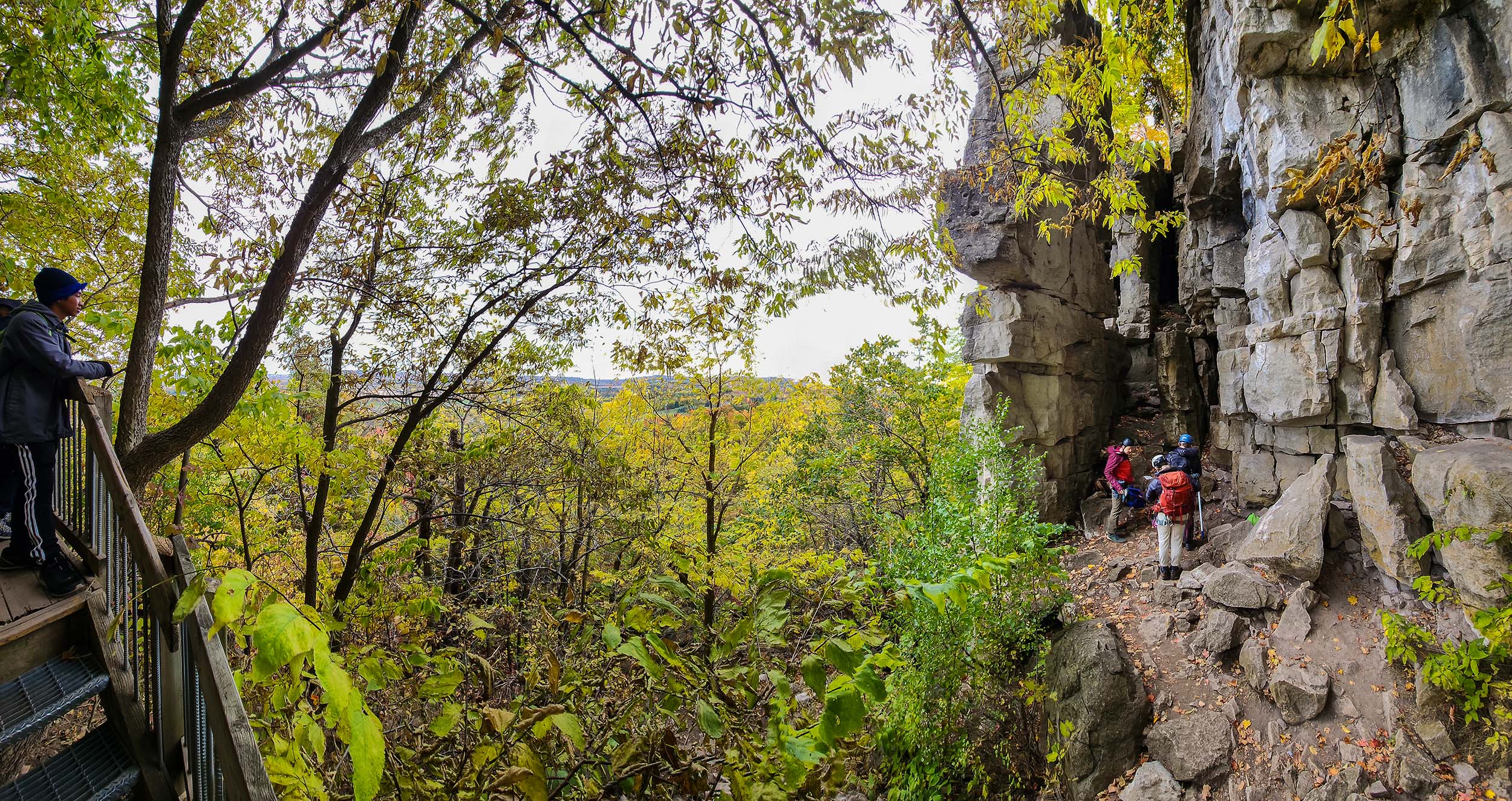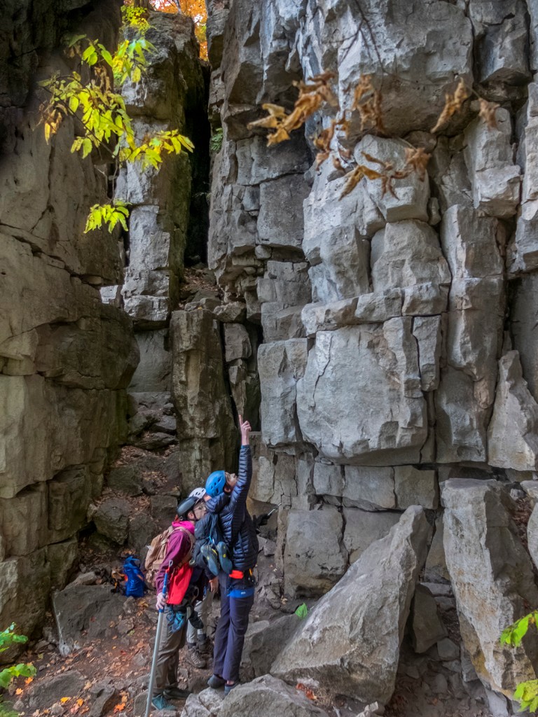 The sun came out periodically to highlight the turning leaves in the trees above and below us – a healthy managed forest whose hidden stars are the Eastern Cedars, native to the area, that can live for hundreds of years even while clinging to the edge of the cliff faces. Rattlesnakes might be (thankfully) scarce these days, but deer can be spotted on quiet days, and there’s always the turkey vultures wheeling overhead by the edge of the cliff.
