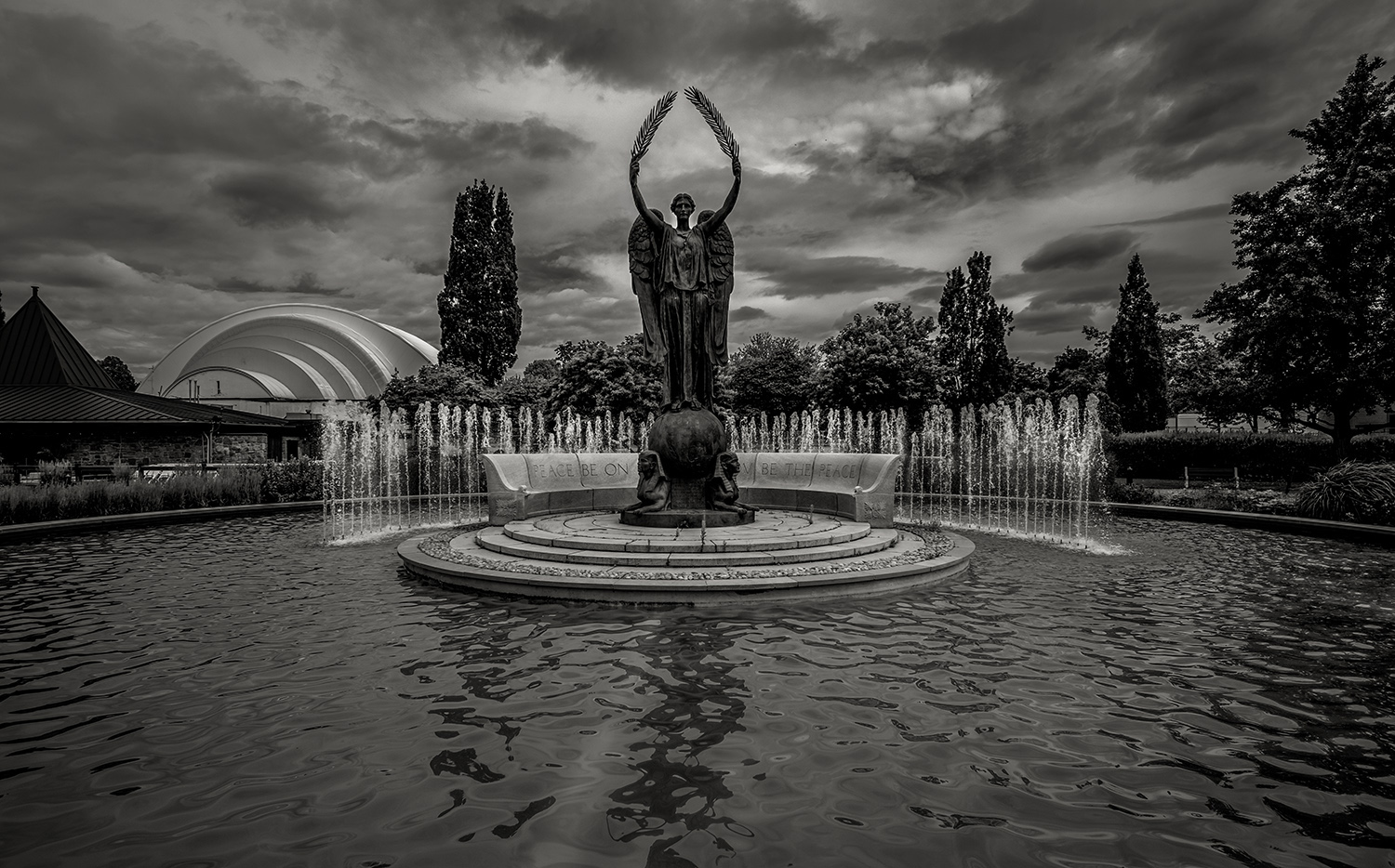 Originally located on a grassy median at the eastern end of the Queen Elizabeth Way, it was moved to a spot in Gzowski Park in 1975 and re-dedicated by the late Queen Elizabeth II, the daughter of George and Elizabeth, in 1989. The inscription, carved at the bottom of the monument under a lion sculpted by Frances Loring, was finished in August 1940, and hints at the uncertain outcome of World War Two in its first years, pointedly noting that it was finished “in the Empire’s darkest hour in full confidence of victory and a lasting peace.”