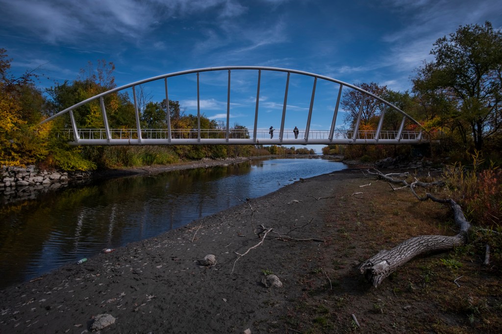 Mimico Creek is crossed with another arched bridge that’s become a visual trademark for the western beaches. Santiago Calatrava designed the Mimico Creek Pedestrian Bridge in 1996; it was opened in 1998, and its single inclined arch is an echo of the bridge over Humber Bay – so much so that visitors to the park mistake Mimico Creek for the much wider and deeper Humber. (Even Google Maps makes this mistake.)